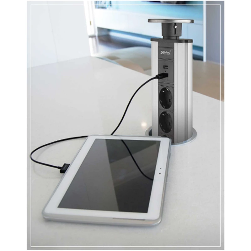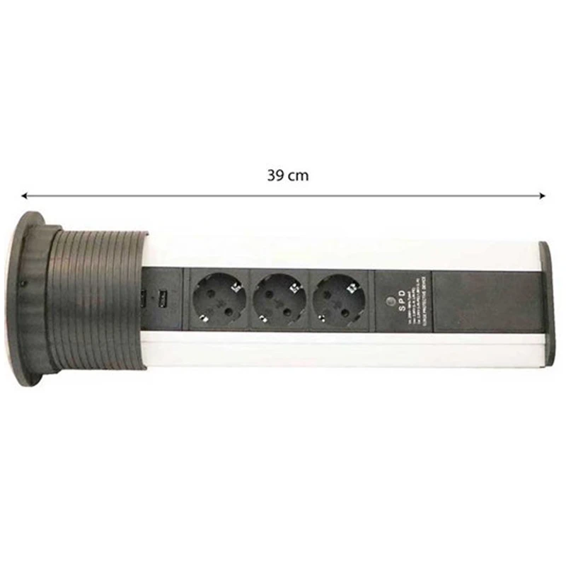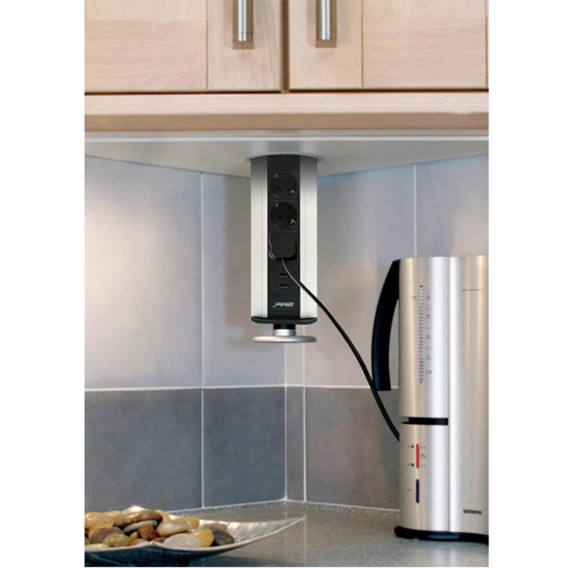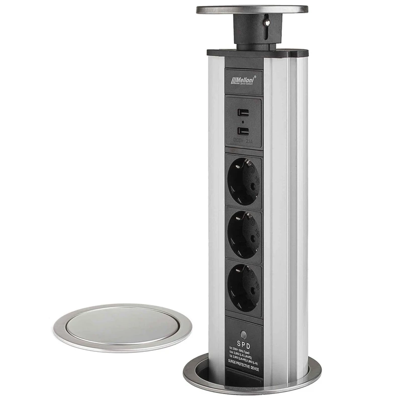 پریز توکار استیل 10008 3 سوکت برق 2 پورت شارژر USB محافظ نوسان برق ابعاد محصول (سانتی متر) : قطر : 11.5 – ارتفاع : 39 ابعاد برش (سانتی متر) : قطر برش : 10